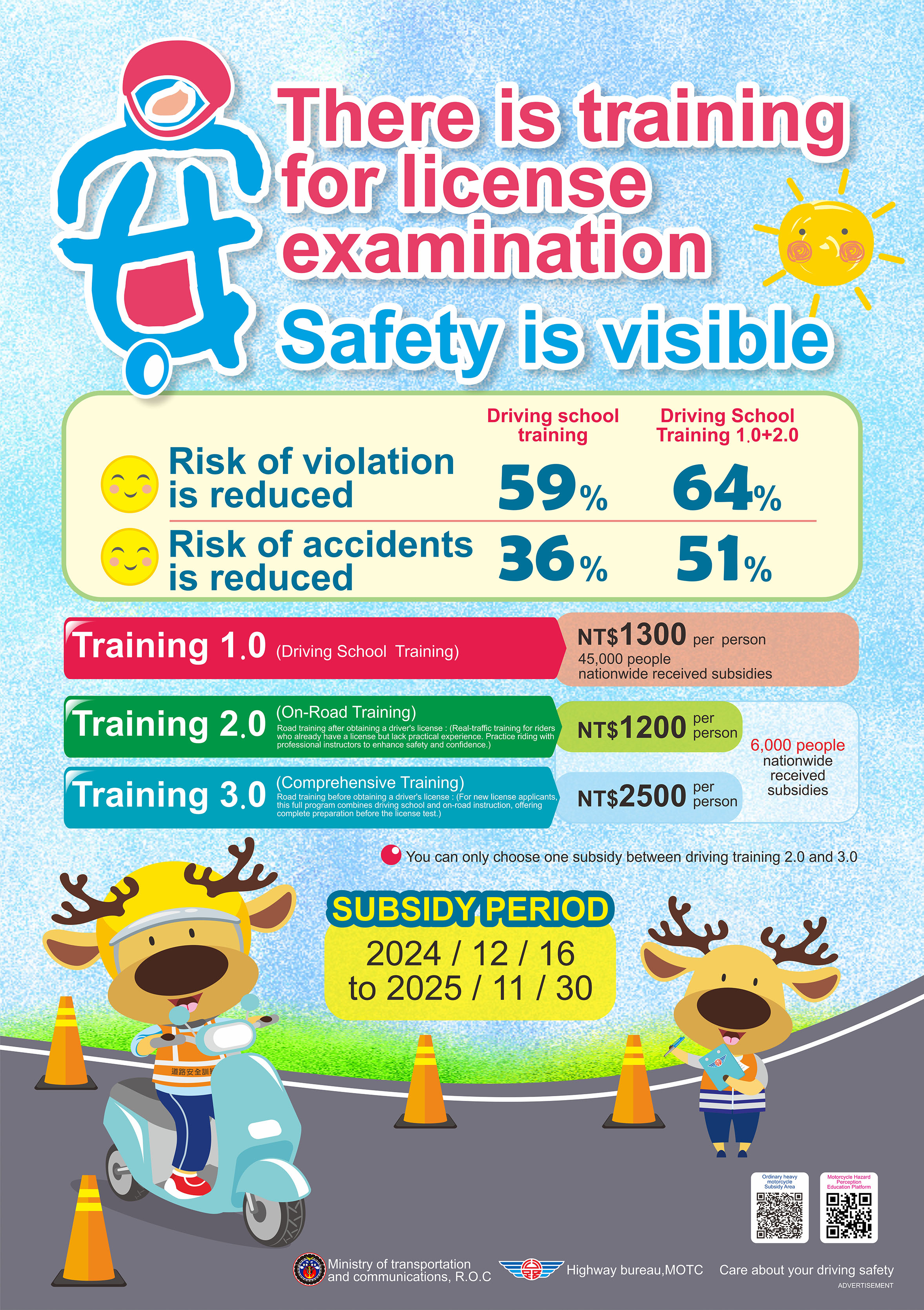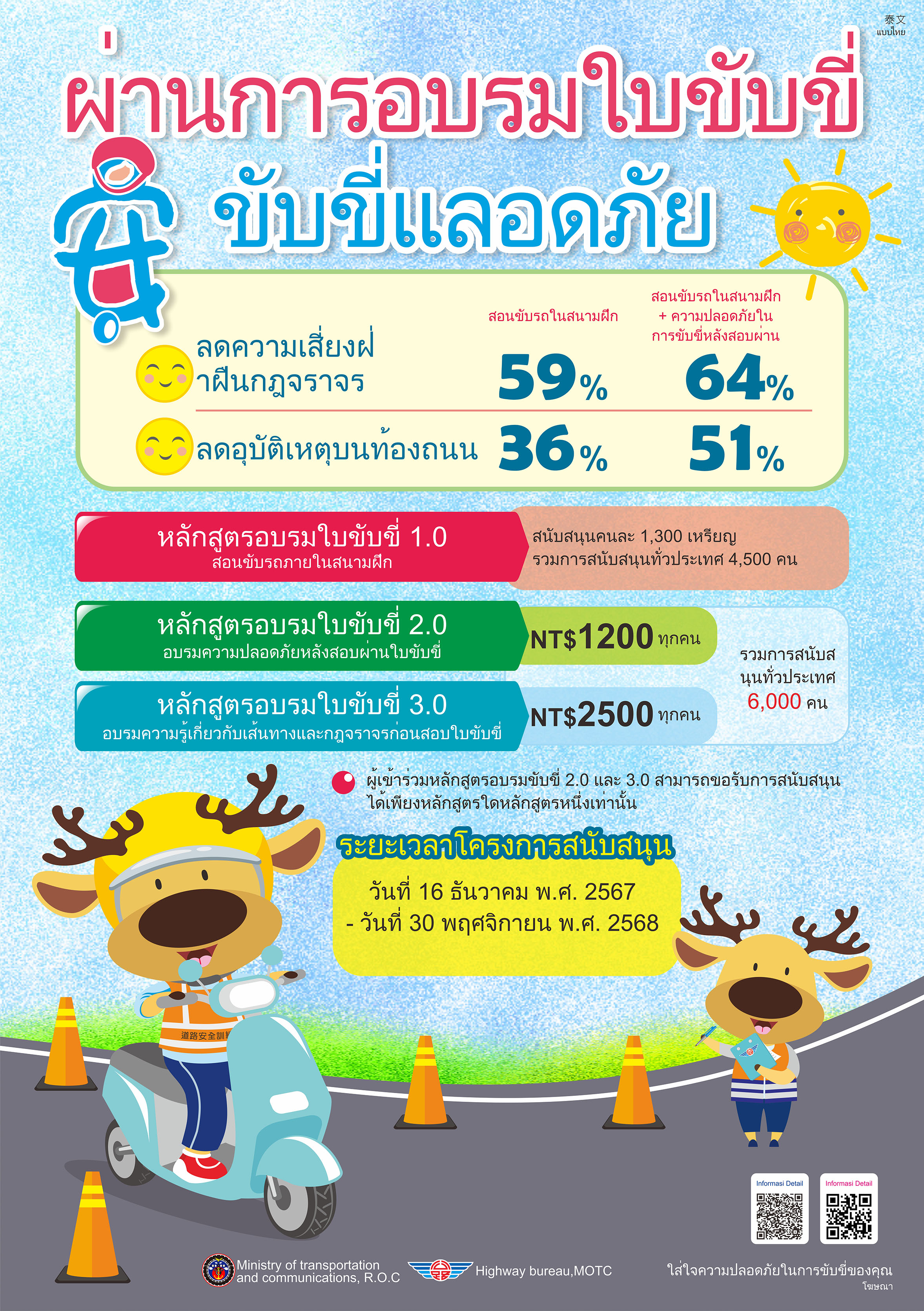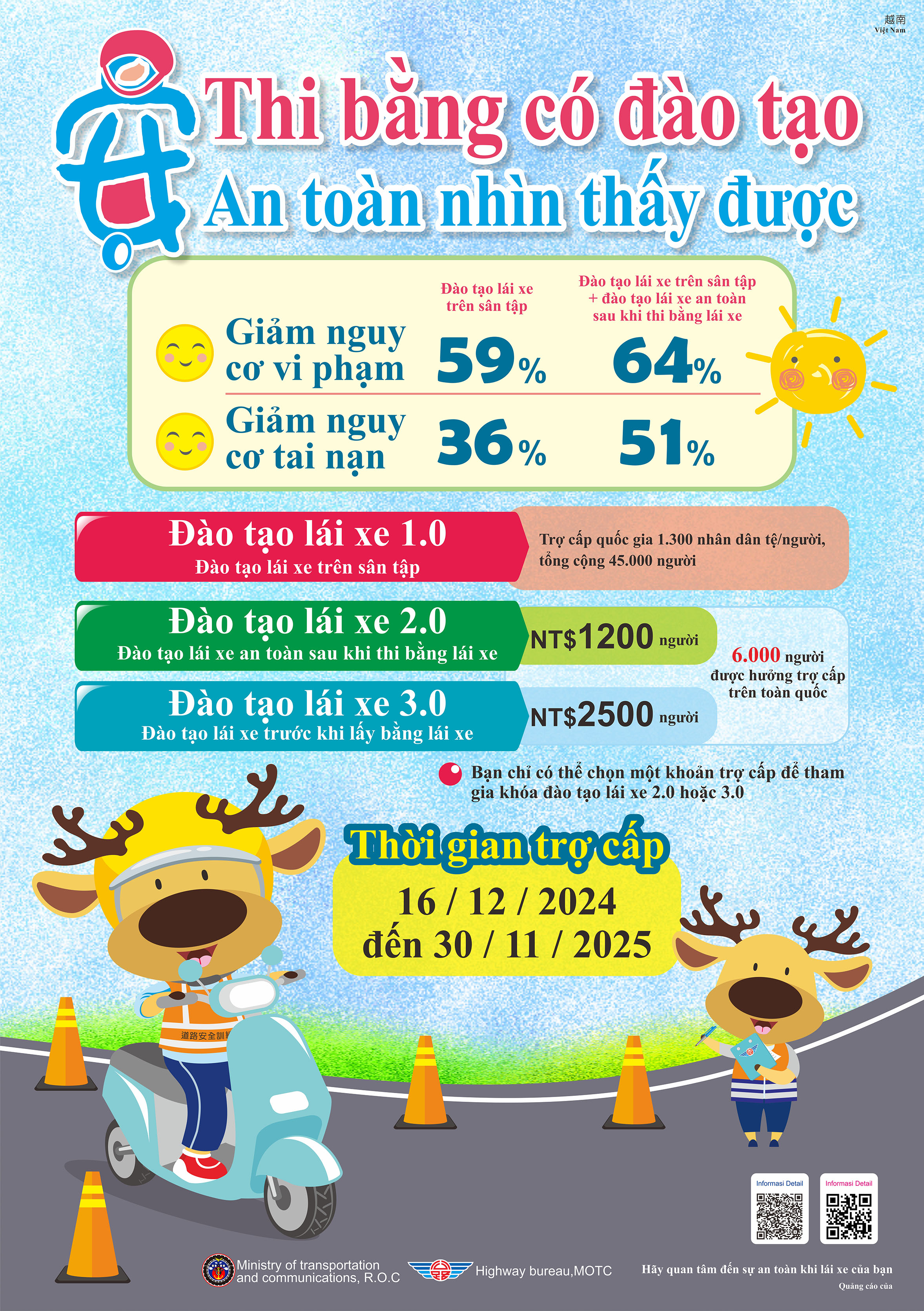 三、為強化學生機車安全駕駛觀念,降低交通意外之風險,請學校運用各種管道加強宣導,另請鼓勵外籍生參加機車駕訓班,建立正確駕駛觀念與培養道路駕駛能力。