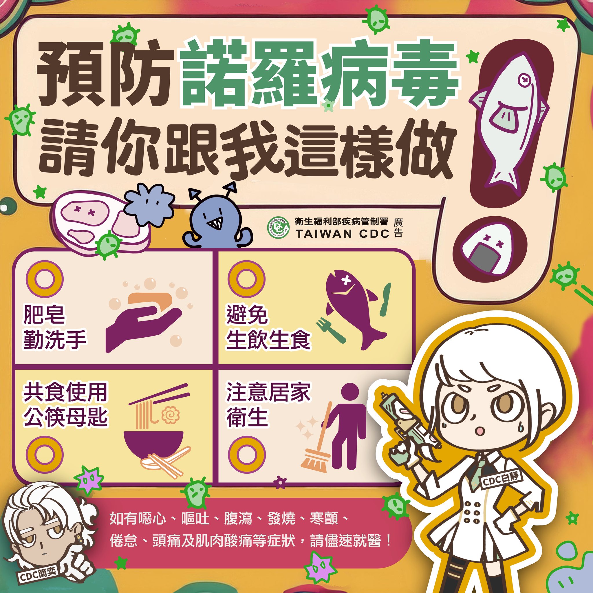 連假出遊、人潮聚集,國內近期腹瀉疫情升溫目前正是諾羅病毒好發時期! 🤢 為了讓大家安心玩、平安回家,請務必做好以下防護: 🔹 勤洗手(一定要用肥皂!) 酒精對諾羅病毒效果有限,務必用「肥皂+清水」洗手至少20秒(如廁後及進食前)。 🔹 避免生食、生飲 貝類(如生蠔)一定要充分加熱再食用。 🔹 餐具分開使用 避免共食、共用餐具,降低交叉感染風險。 🔹 建議消毒要用漂白水 清潔環境使用稀釋漂白水1000ppm (20cc漂白水+1公升清水)。 嘔吐物使用稀釋漂白水5000ppm (100cc漂白水+1公升清水)。 🔹 有症狀請在家休息 出現嘔吐、腹瀉症狀,請停止上班上課,避免傳染他人。 🔹 旅遊後不適請儘速就醫 旅遊後若有不適症狀請儘速就醫,並告知醫師旅遊史及接觸史以利診斷及治療。 ⚠️ 常見症狀 ✔ 噁心 ✔ 嘔吐 ✔ 水瀉 ✔ 腹痛 ✔ 輕微發燒 通常症狀持續1-10天,1–3天可緩解,但幼童與長者需特別注意脫水情況。 🎒 出遊開心最重要 🧼 防疫做好更重要 資料來源:衛福部疾管署