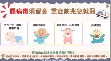 1.注意腸病毒重症警訊!若孩子出現嗜睡、意識不清活力不佳、肌躍型抽搐、手腳無力、呼吸急促、持續嘔吐、心跳加快等重症前兆,請儘速前往醫院就醫!腸病毒可能引發嚴重併發症,務必提高警覺。 南市5家腸病毒責任醫院:成大醫院、永康奇美醫院、郭綜合醫院、臺南新樓醫院、麻豆新樓醫院。