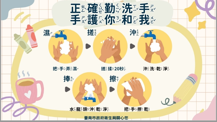 2.預防勝於治療,勤洗手、避免接觸病童,共同守護孩子健康! 正確勤洗手,手護你和我!腸病毒、流感等病毒經由手部傳播,正確洗手是最有效的預防方式!請記住洗手5步驟,用肥皂搓洗雙手至少20秒,讓細菌病毒無處可藏!守護自己與家人的健康,一切從「洗手」做起!