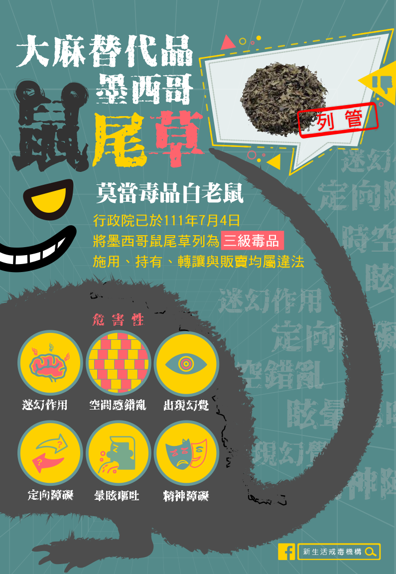根據我國衛福部「管制藥品簡訊」第十期,墨西哥鼠尾草(Salvia divinorum)含有沙維諾林A(salvinorin A),具精神活性有效成份,使用者吸入沙維諾林A(salvinorin A)後,產生短暫但強烈類似 LSD的迷幻作用,在使用過後會有強烈的失重感、空間感錯亂,又被使用者戲稱飛行草。另有文獻報導指出,濫用墨西哥鼠尾草會導致精神障礙及精神分裂症,在美國甚至有因使用墨西哥鼠尾草而導致自殺的案件發生。 「墨西哥鼠尾草」尚未列為第三級毒品時,因為價格較大麻便宜,且都同屬中樞神經迷幻劑,因而許多大學生會用其來替代大麻,再加上透過拍賣網站便能購買取得,因而越來越氾濫,因此日前法務部為預防濫用造成毒害,召開毒品審議委員會,討論後認具有成癮、濫用、危害等三項毒品特性,長期施用恐導致精神障礙,決議把「 墨西哥鼠尾草 」列管為「 第三級毒品 」並送行政院覆核,業已於111年7月4日將「墨西哥鼠尾草」及「沙維諾林A」增列為「第三級毒品」,只是許多賣家卻還是公然在拍賣網站上販售,完全無視禁令,常見取得管道有網路平台蝦皮、國外網站Reddit,散發價格1200-1500不等,取得十分容易,在此也呼籲民眾不要小看鼠尾草的成癮性,切勿以身試法!